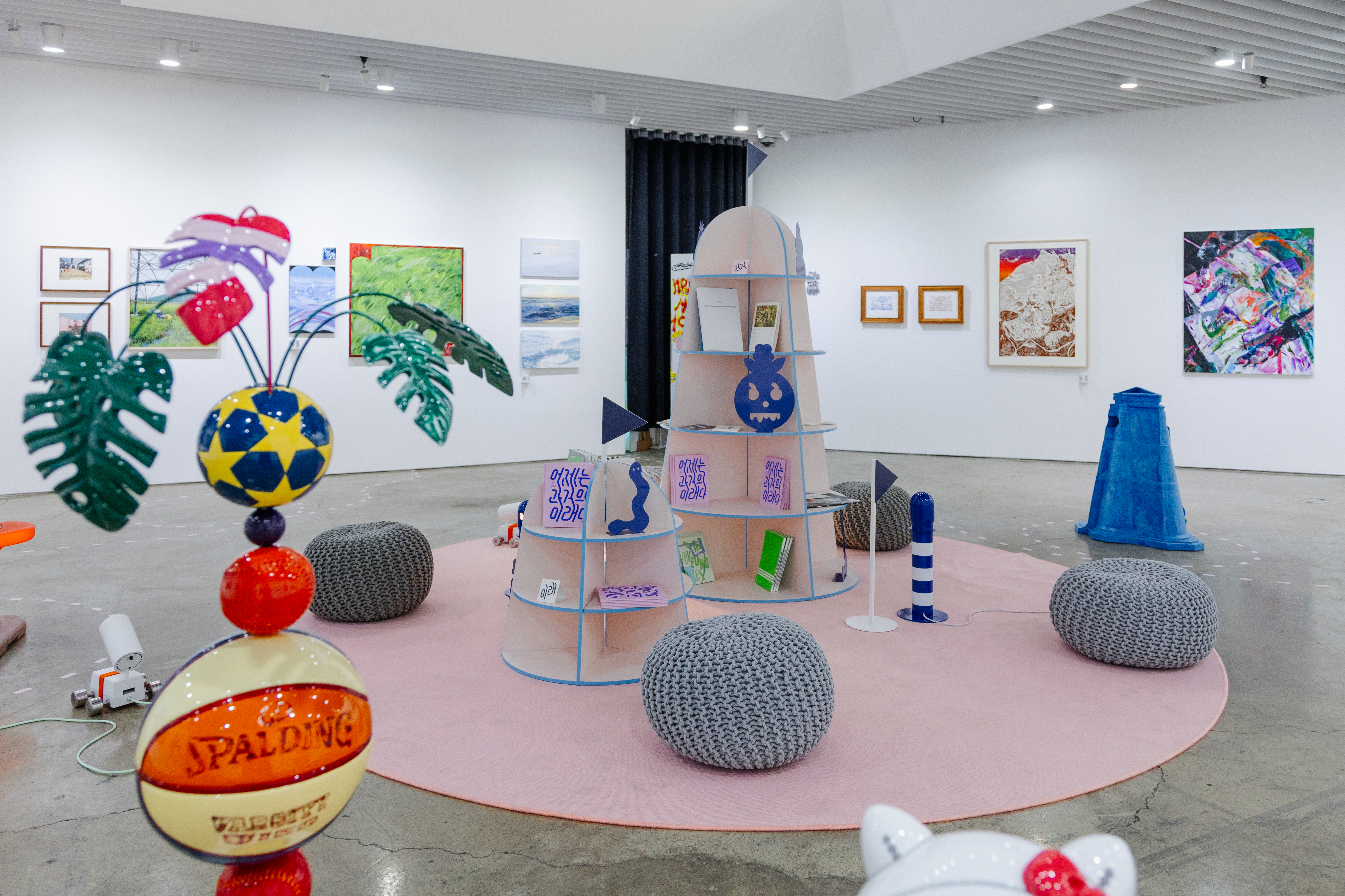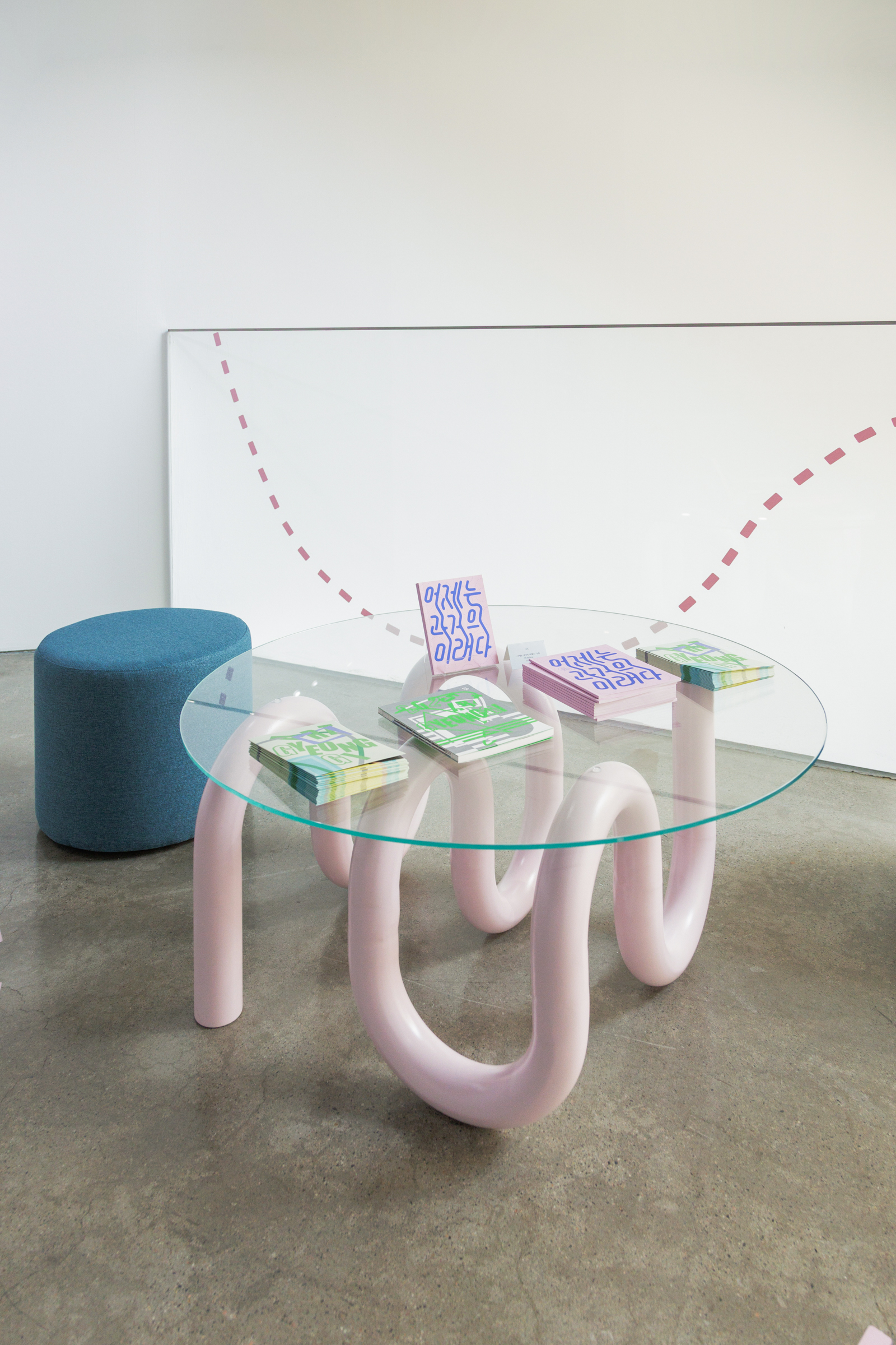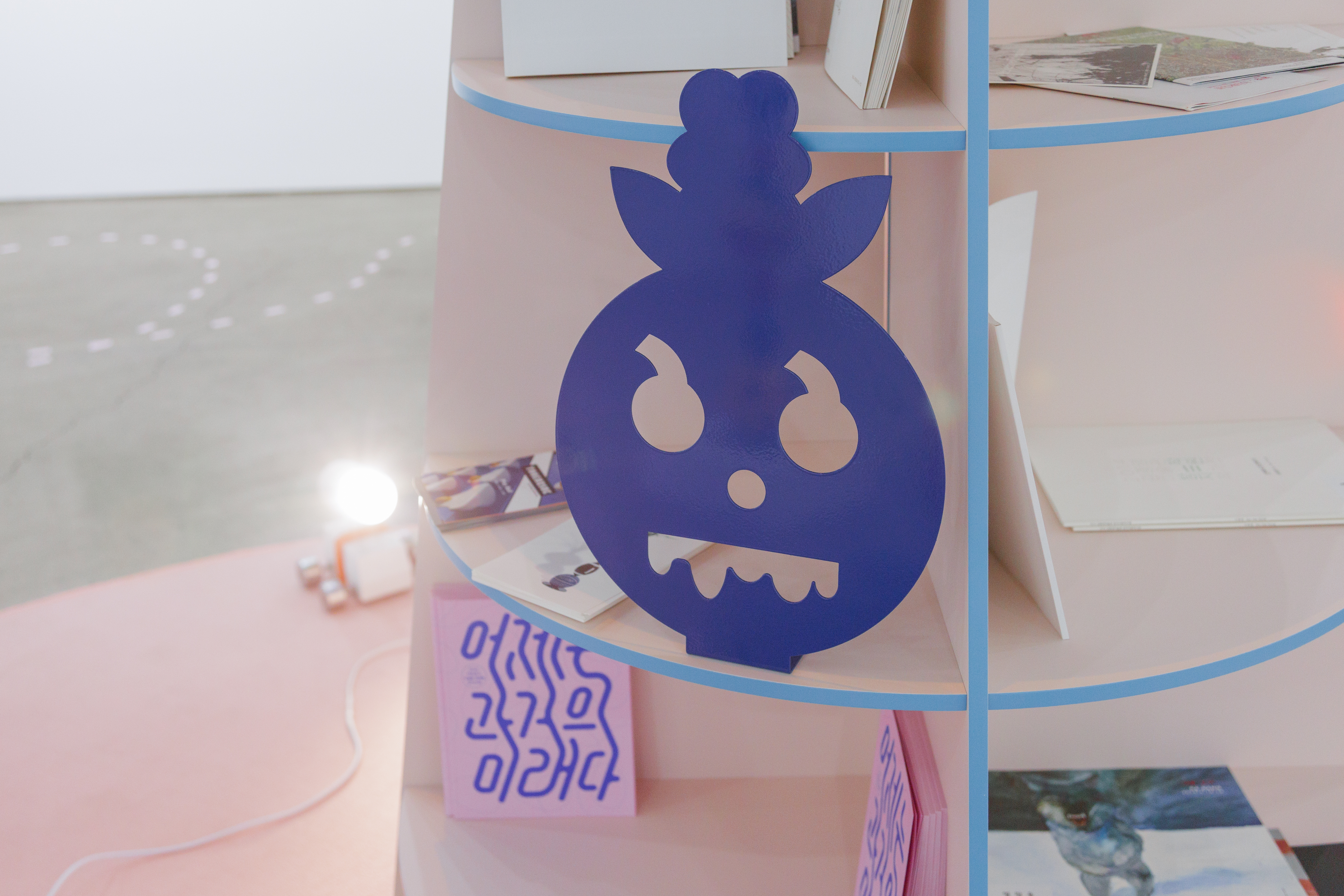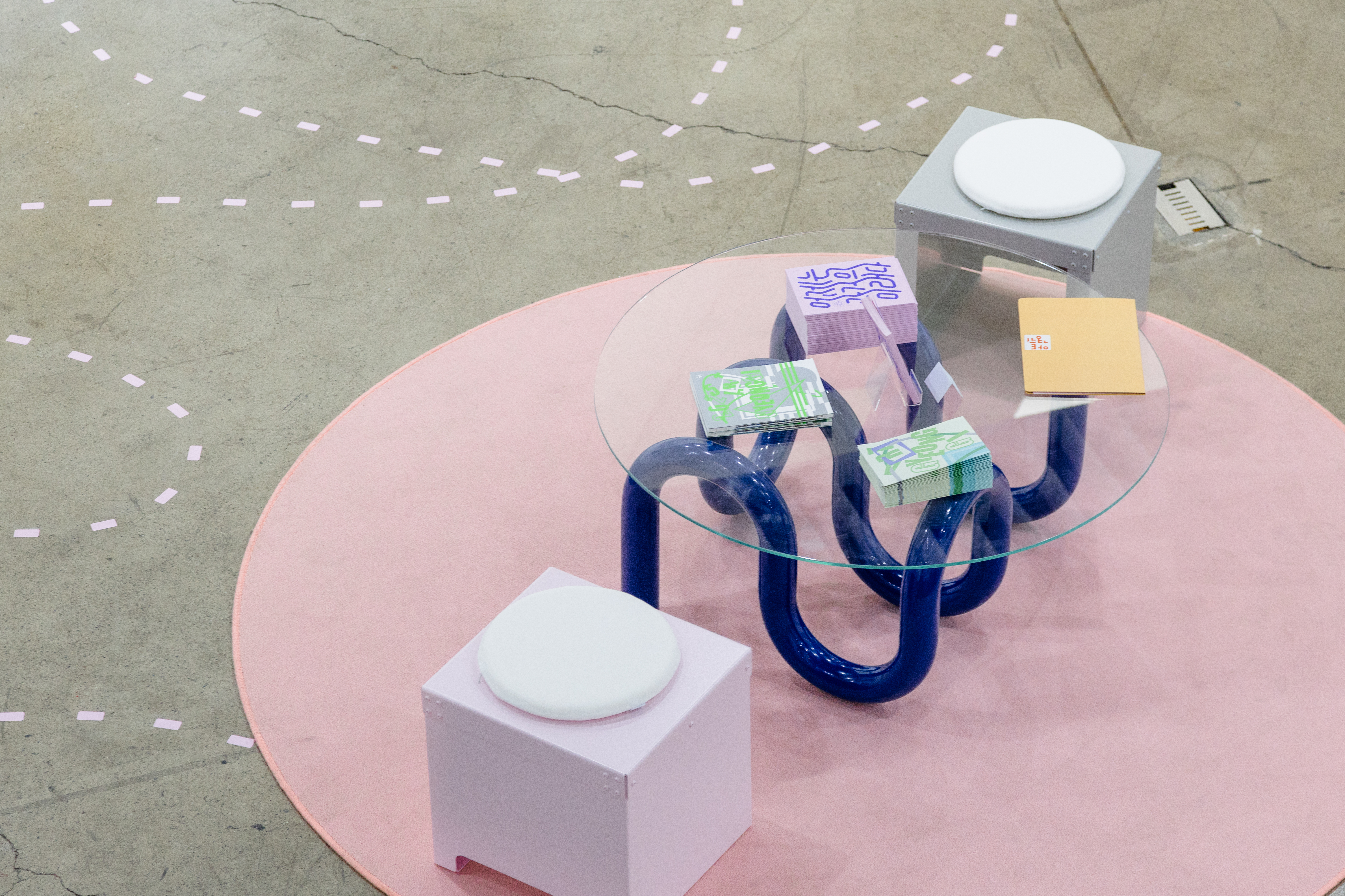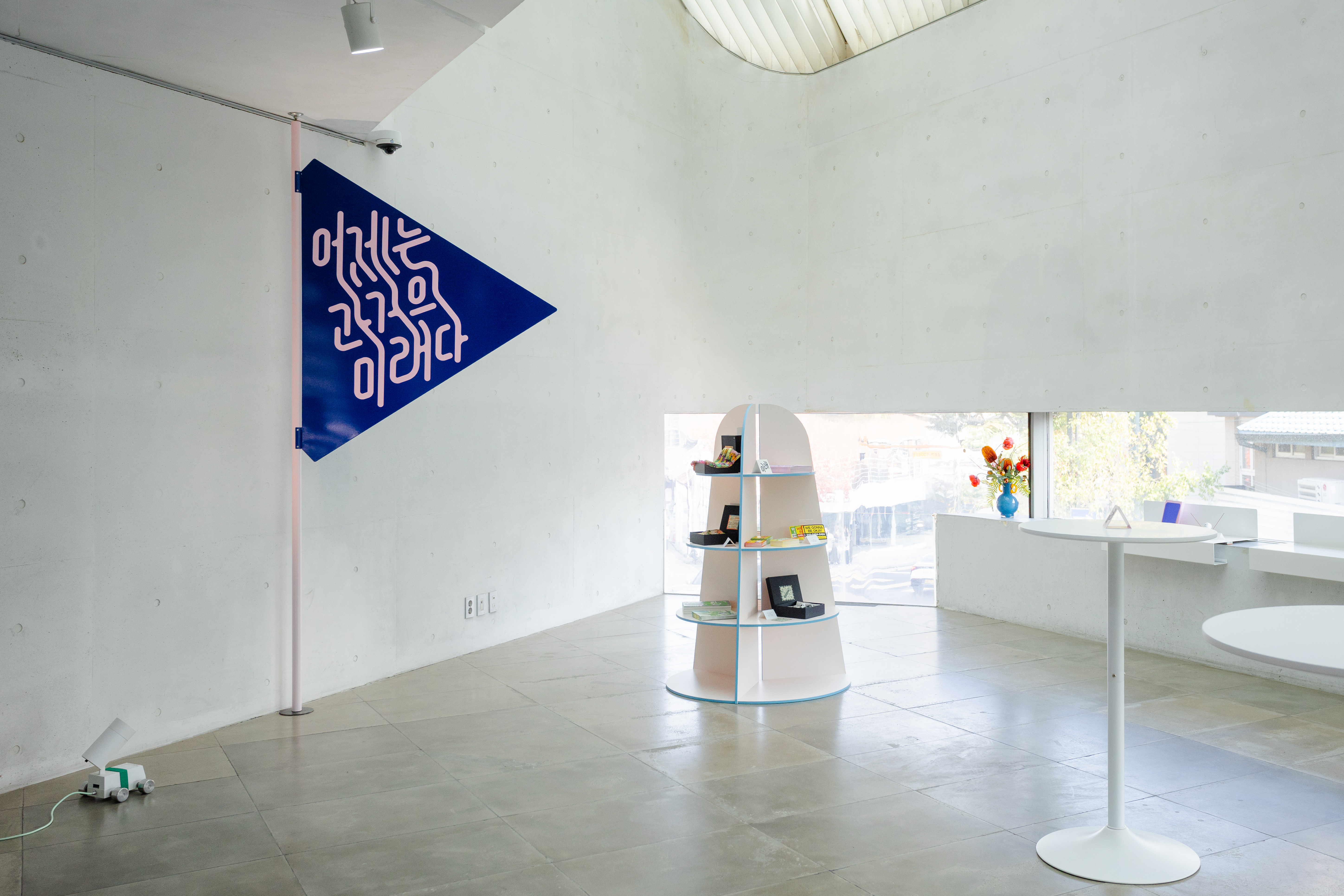 다양한 작가와 방문객이 언제든 찾아와 일상 속에서 문화예술을 향유할 수 있도록 기획된 전시라는 점에서, ‘섬’이라는 공간적 콘셉트를 설정했습니다. 이질적인 사물과 소재가 모인 환경 속에서 관람객이 작품 사이를 탐험하듯 이동하는 모습을 상상하며, 가구와 집기, 깃발과 부표를 연상시키는 사이니지, 자취를 따라가는 듯한 점선 형태의 공간 그래픽을 디자인했습니다.