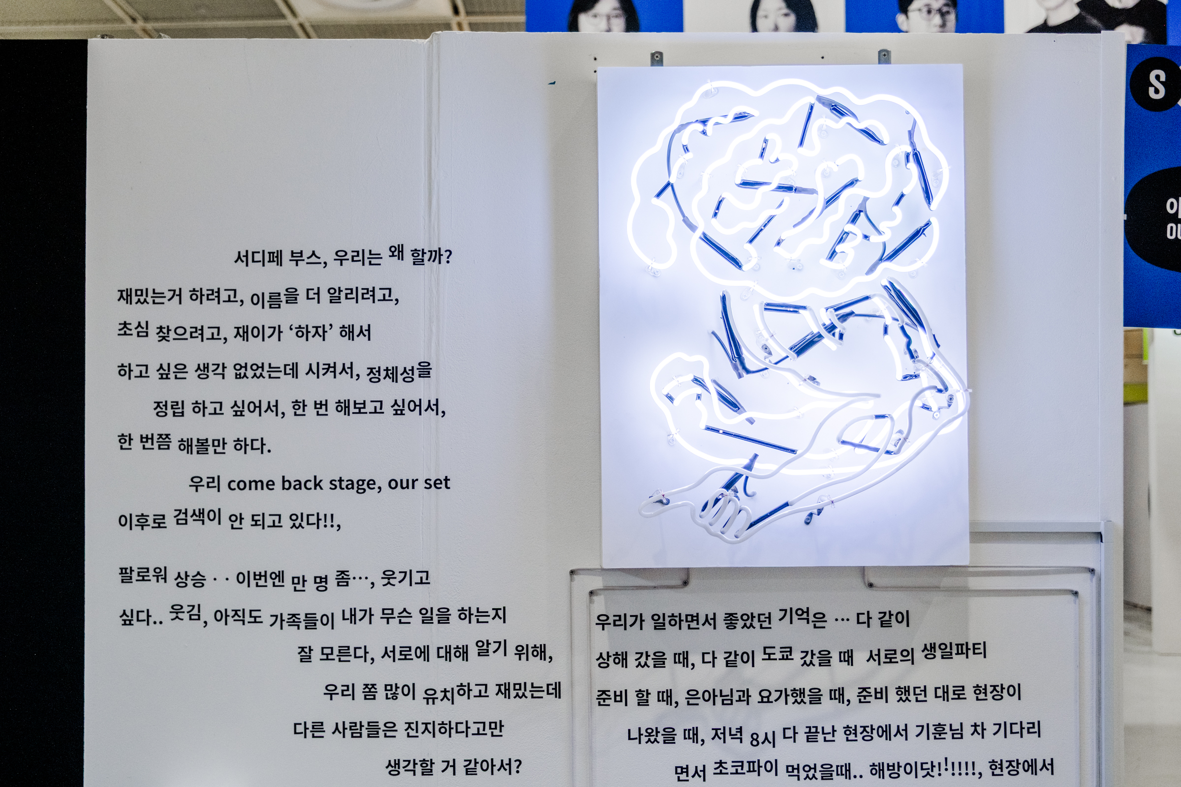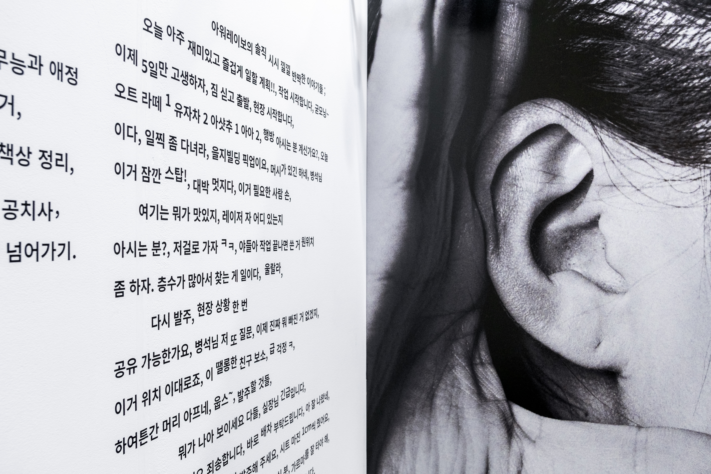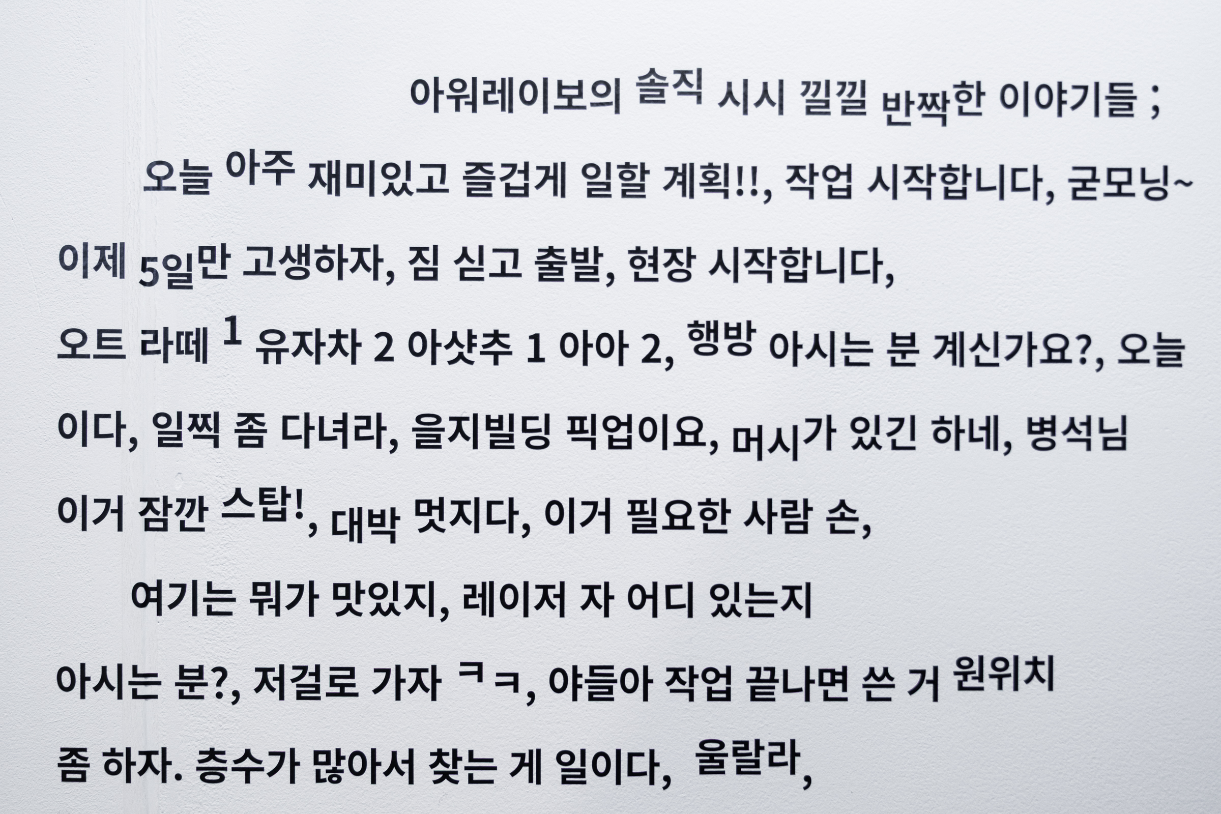 이번 전시 ‘아워레이보’는 우리가 만든 결과물보다, 만들어나가는 방식을 공유하는 데 집중합니다. 프로젝트보다 먼저 존재하는 ‘우리의 말’들, 서로에게 건네는 단편적인 생각, 일에 대한 태도, 좋아하는 것과 멀리하고 싶은 것들이 우리의 정체성을 설명할 수 있다고 믿기 때문입니다.