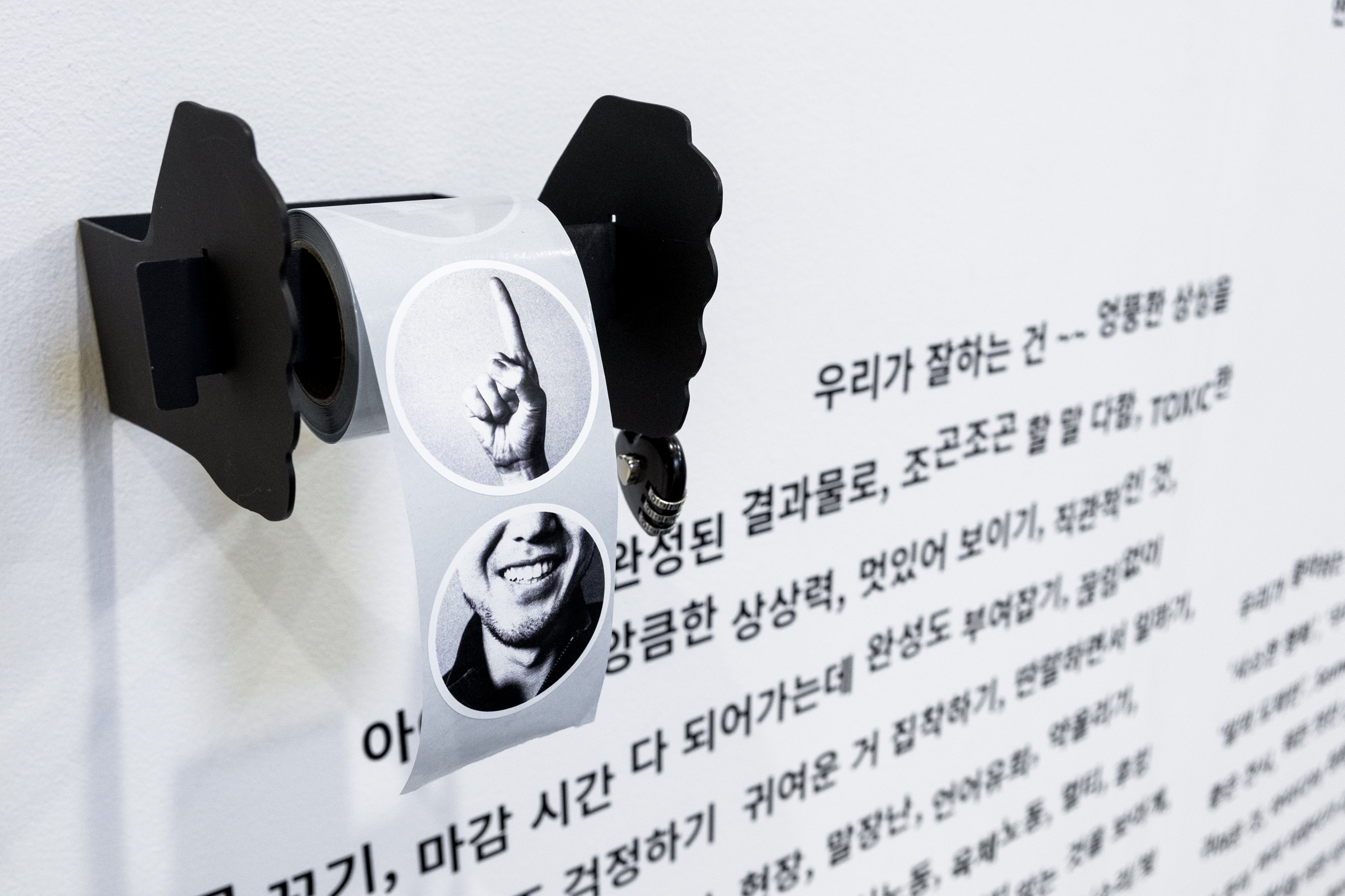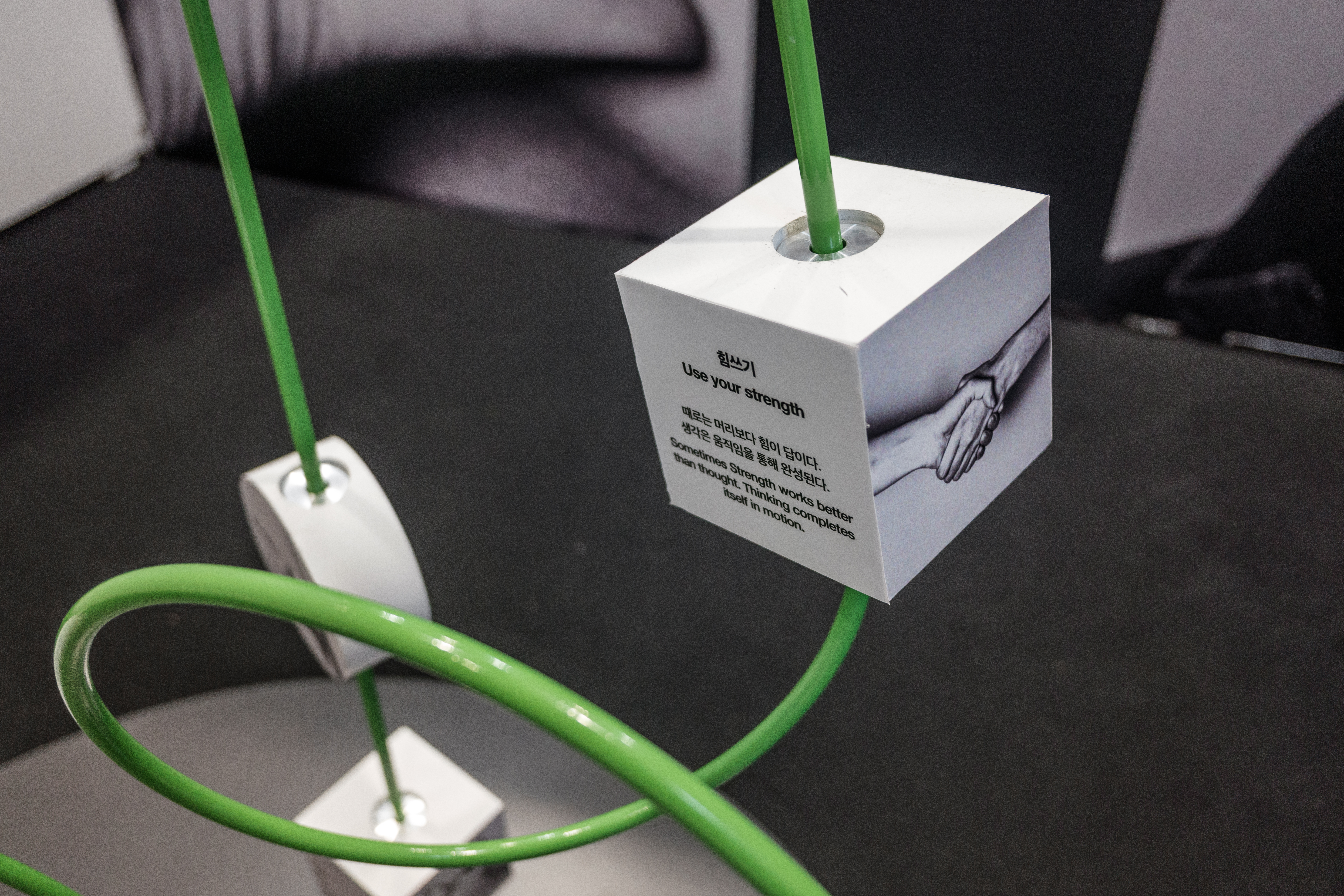 전시의 중앙에 놓인 조형물은 어린이 장난감에서 착안한 것입니다. 블록을 돌리면 나타나는 문구는 아워레이보가 기준으로 삼아온 행동강령입니다. 단단한 문장을 손으로 돌려 읽는 행위와 이미지를 결부시키는 과정은, 고정된 의미를 더 부드럽고 유연하게 받아들이는 방식을 상징합니다. 일과 놀이 사이에서 생겨나는 작은 즐거움과 긴장, 즉흥적인 에너지 또한 우리가 중요하게 생각하는 감각입니다.