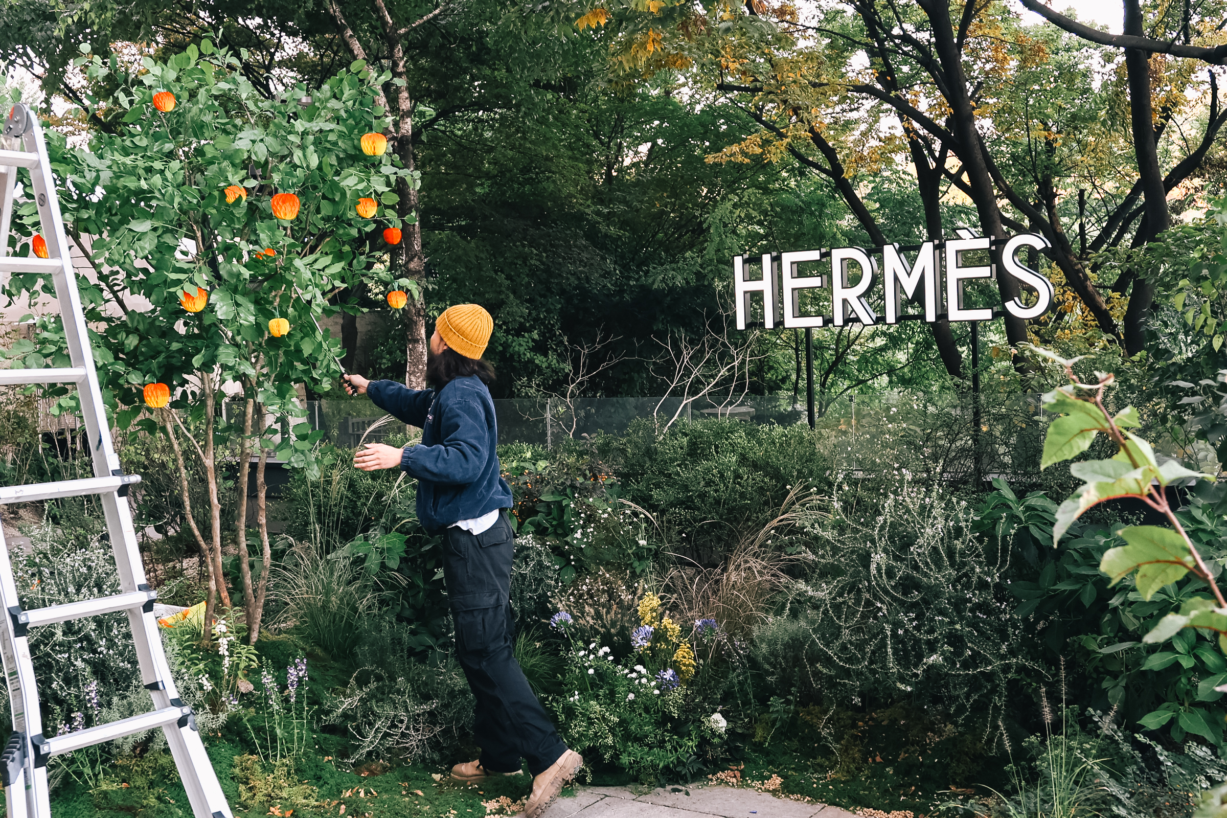 신라호텔 에르메스 매장의 가든 파티를 위한 이벤트 시노그라피를 디자인하고 플라워 연출을 진행했습니다. 이번 프로젝트를 준비하며 루프탑 가든의 식생과 분위기를 경험하고 그 인상을 토대로 시노그라피를 디자인했습니다. 이번 작업은 공간과 식재가 단순한 재현을 넘어서 서로 다른 두 장소 사이의 감각적 연결을 중심에 둔 매개로, 브랜드가 지닌 조형 언어와 계절의 흐름이 자연스럽게 스며들 수 있도록 하였습니다.